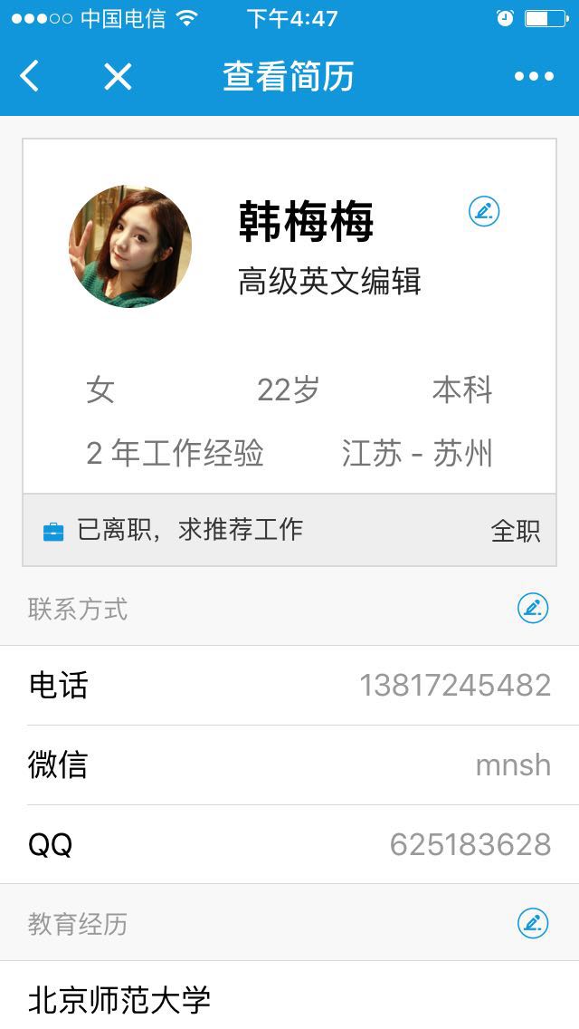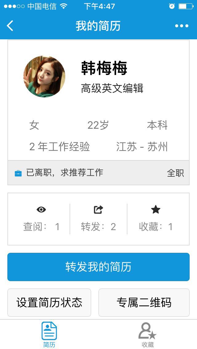 创建一份随身的工作简历,需要的时候随时分享。同时可以转发给你的朋友帮忙推荐哦。