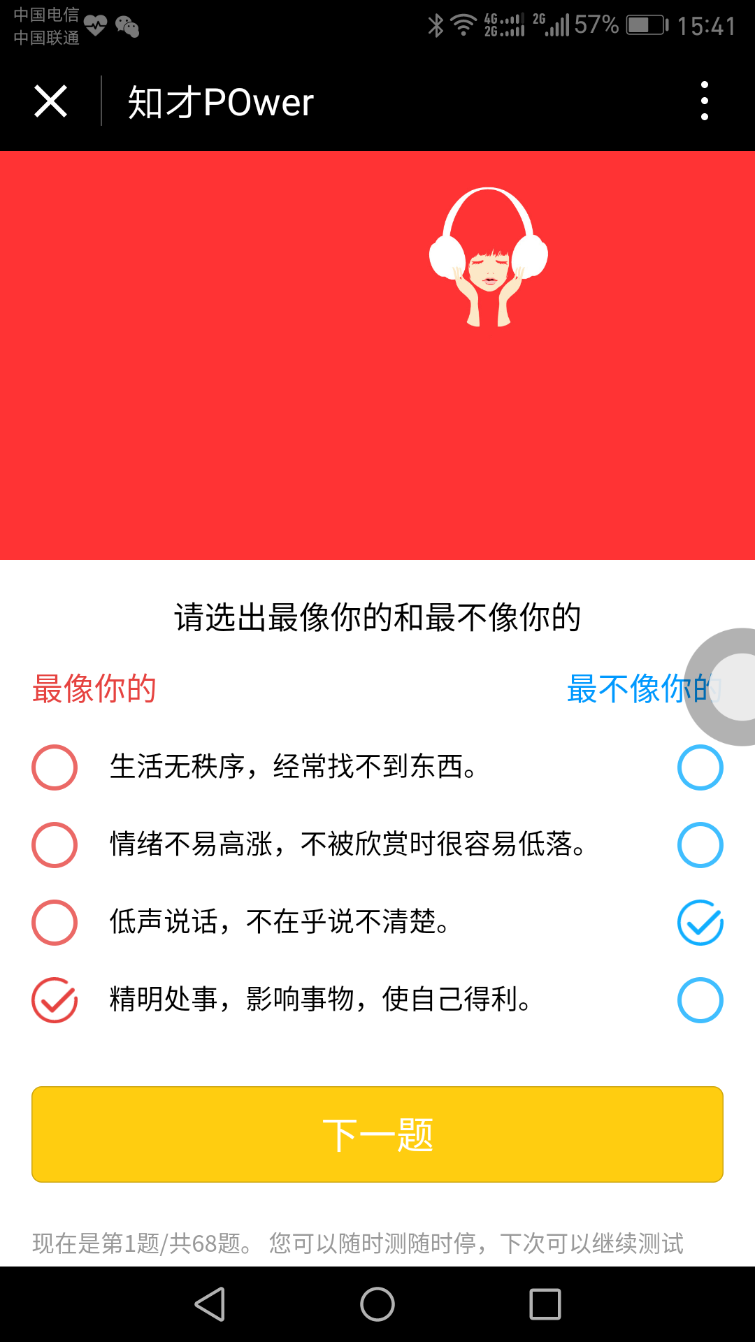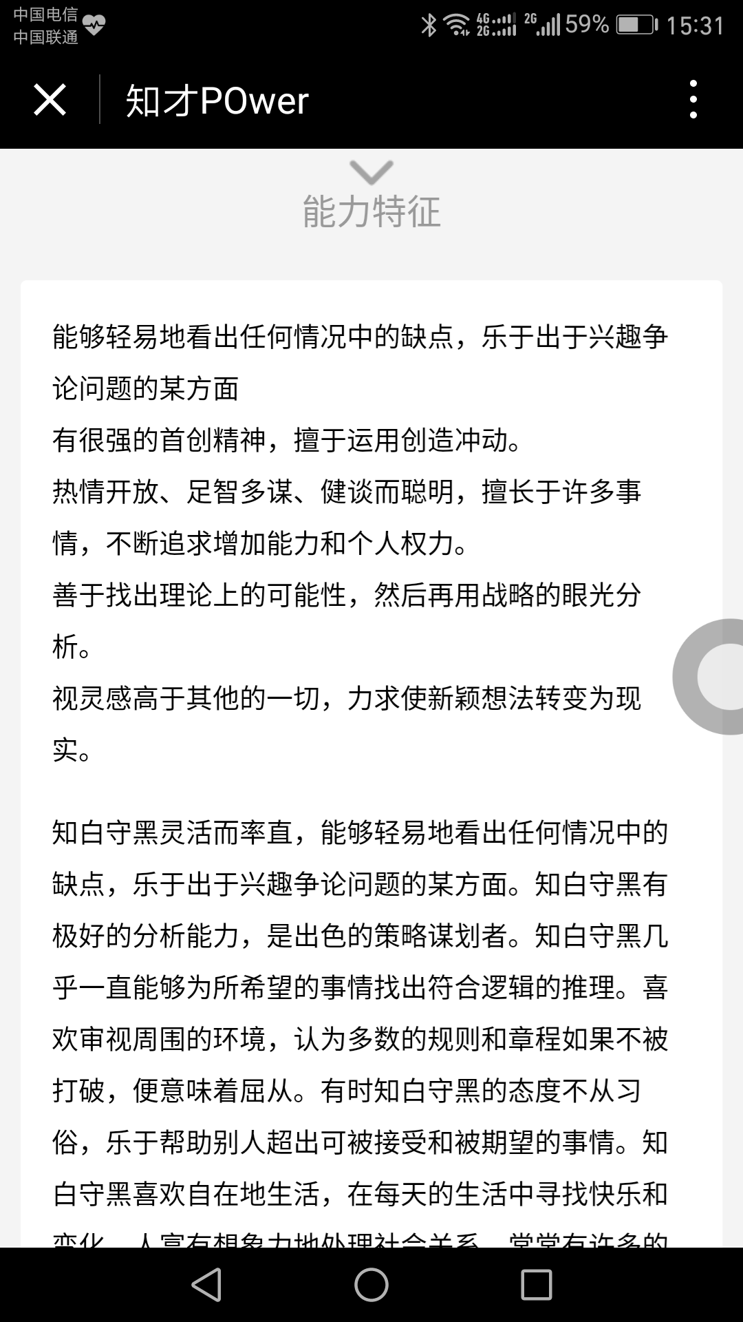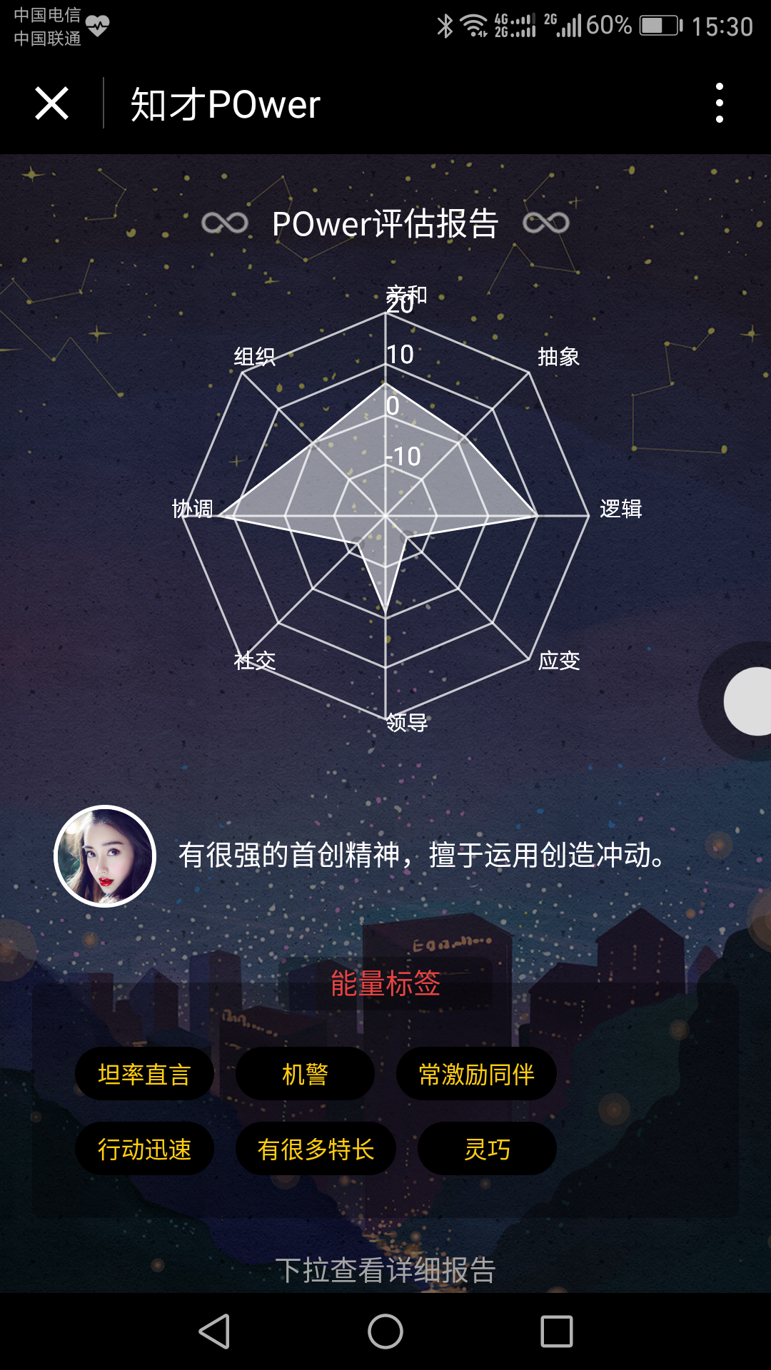 小程序描述:从认知、心理、行为、性格上进行综合分析,依托6个能力值,2种思维模式,5个维度的心理感观。生成个人综合评测的8角数据。结合MBTI和DISC的评测,打造测试结果最准,试题最符合中国人的评测系统。同时借助社交平台,进行分析报告的传阅,加深朋友和团队成员间的了解。为了结果的严谨性,我们设置了68道试题。因为专业严谨,值得您耐心对待。