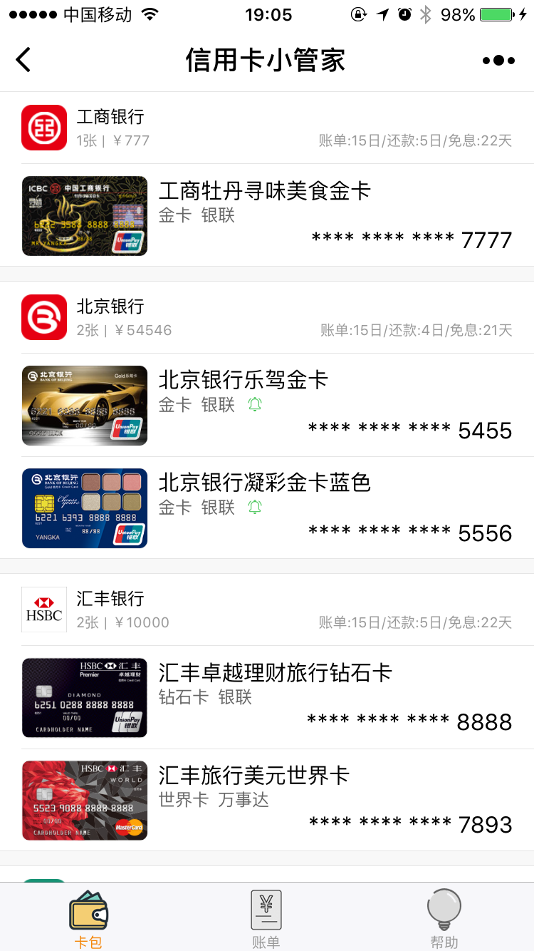 虚拟卡包管理与账单记录,方便随时随地查看自己所有信用卡以及账单 拥有最全的卡片信息及智能的信用卡管理功能,帮你从繁琐中解放出来,欢迎试用