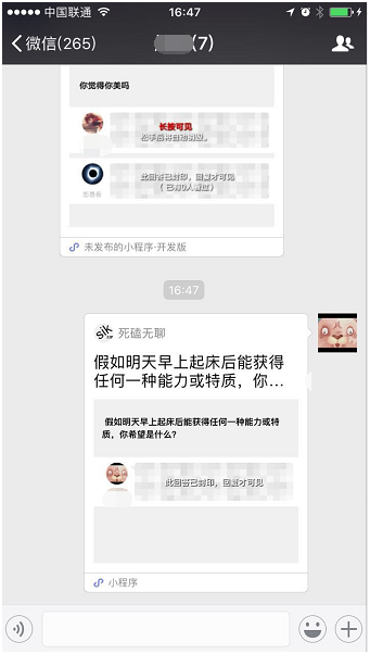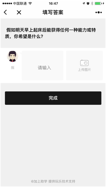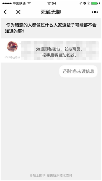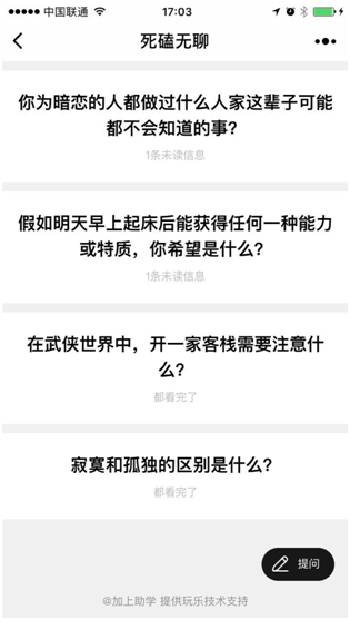 一个专注问答唠嗑的阅后即焚小程序。 有效找到共同话题,问出想问又不敢问的,找到脑路最清奇的朋友。 不仅消除无聊,还能让你跟别人更有聊。