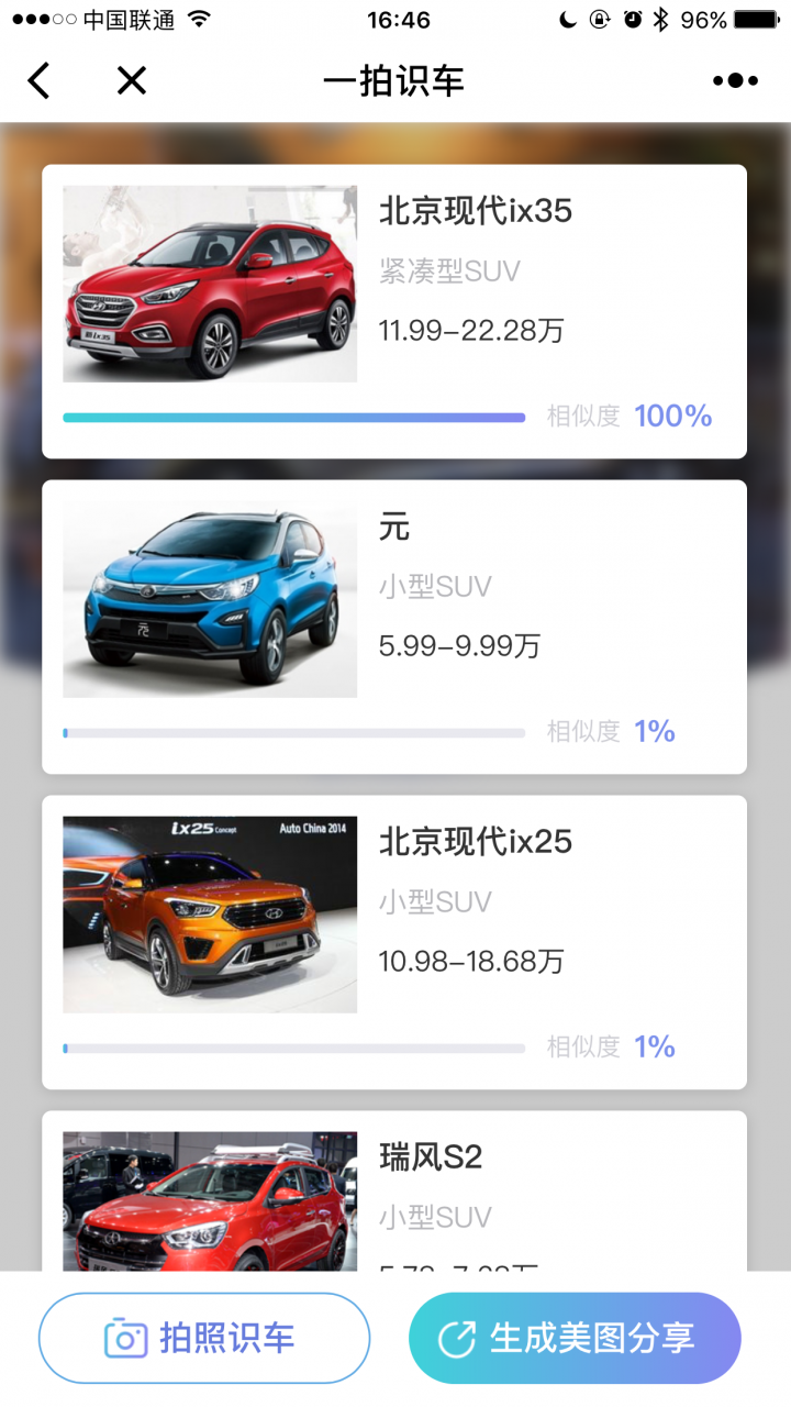 一拍识车是一款街头扫描识车的C端产品。 微信小程序“一拍识车”正式上线啦!遇到陌生车型不用慌,只需扫一扫,一秒即可轻松掌握车型信息,秒变朋友圈里的识车大神!不信就来试试看!……经历了近一年的不断改进和全新AI技术的融合,调集了全球完整的汽车产品图像数据,并在优图实验室的AI算法和2500款车型“人类智能”校对下改进算法后,对于目前现存的所有车型可以实现评论95%以上精准识别率。这是大数据、AI以及专业化下的人工智能的成果!
