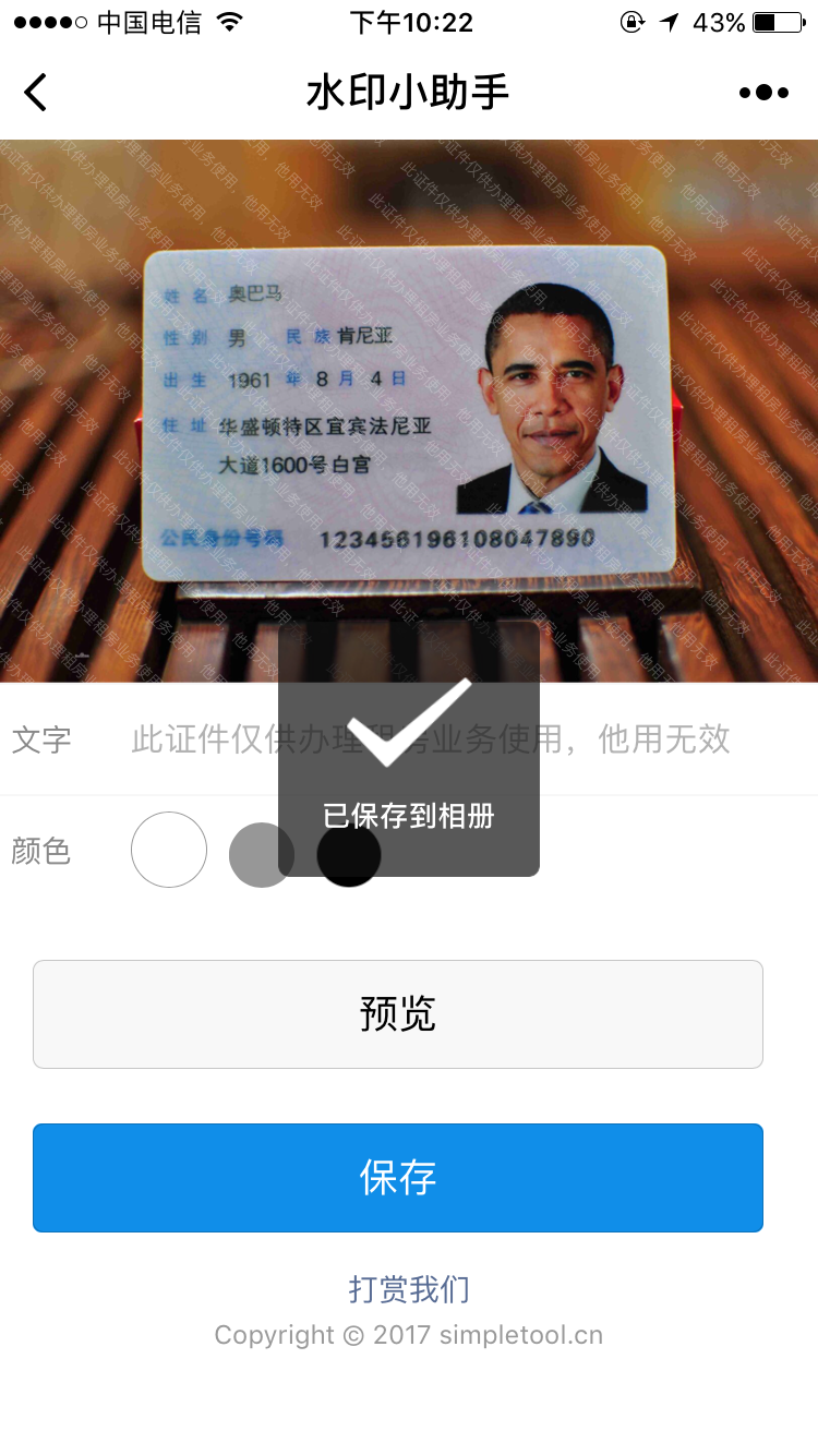 一键给身份证等证件加水印标明用途,防止侵权盗用