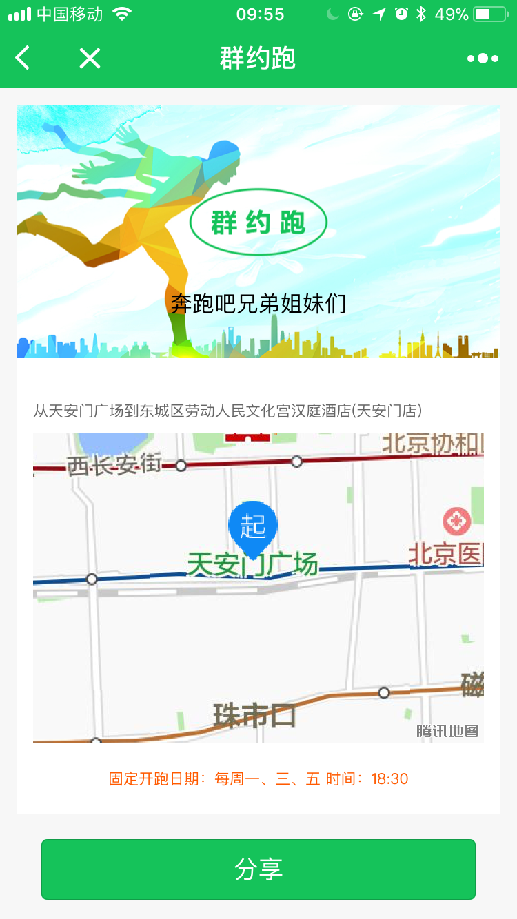 该小程序用于发布约跑活动,附近的人可加入,下班跑回家,周末一起跑,大家一起跑起来!