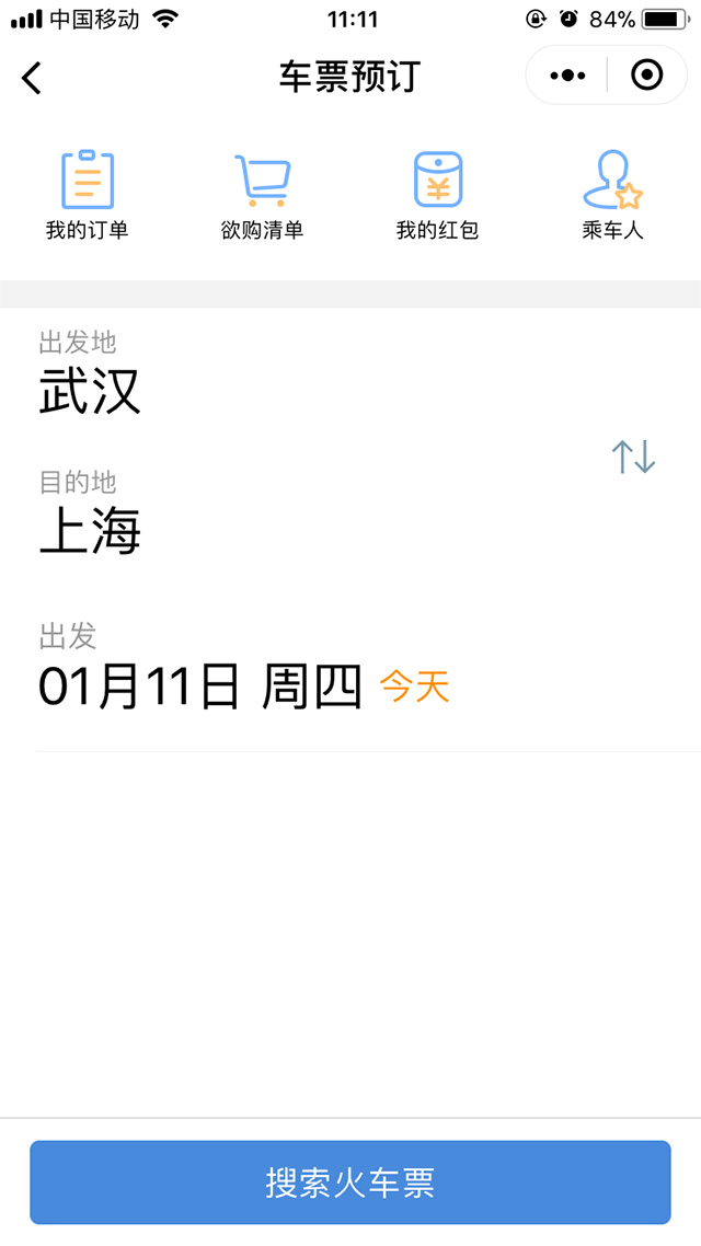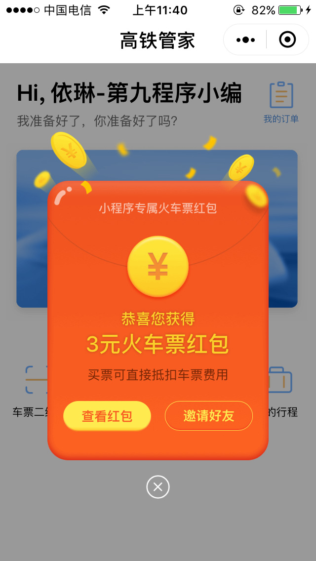 没错,就是一个红包呦!最大是10元,不过小编运气一般就只领到了3元钱,这个红包可以直接抵扣车票费用,还是挺划算的。接着就能看到小程序的首页了: