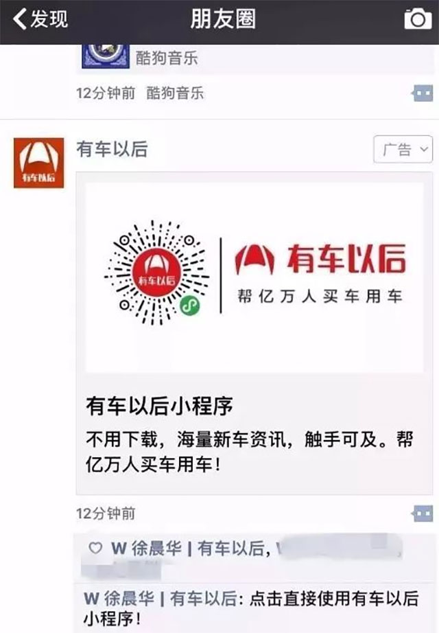【小程序部落】近日,有网友发现朋友圈出现小程序广告,点击就能直接进入小程序! 投放这条朋友圈小程序广告是【有车以后】小程序,还记得【有车以后】小程序在去年11月的时候,就斥巨资在广州塔投放了小程序广告,这次同样也是第一个在朋友圈投放广告的第一个小程序。