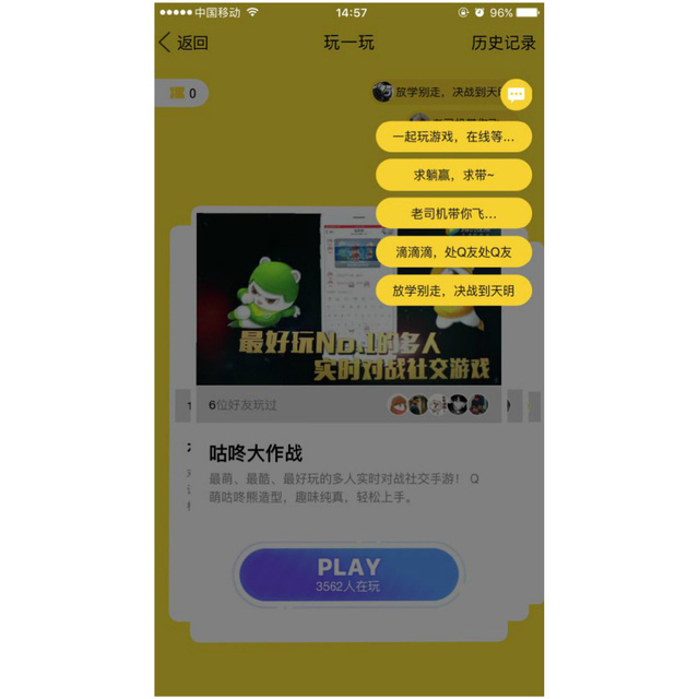 同时,游戏首页上方会有其他用户发出的弹幕飘过,点击弹幕进去可以看到该用户的个人资料页面, 其它用户也可点击发出自己的弹幕。这是 QQ 将年轻化互动玩法引入游戏社交的一个尝试。