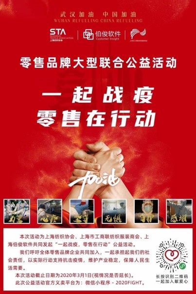 疫情期间,伯俊与客户联系的过程中,感知到大量零售企业即使自身都已比较困难,但仍希望为战疫提供力所能及的支持,为此,伯俊特别联合上海纺织协会、上海工商联纺织服装商会,一起发起”一起战疫,零售在行动“的大型联合公益活动,通过行业协会为疫区捐款,伯俊则为这些企业免费提供社交营销等服务,目前已有40多家企业参与。