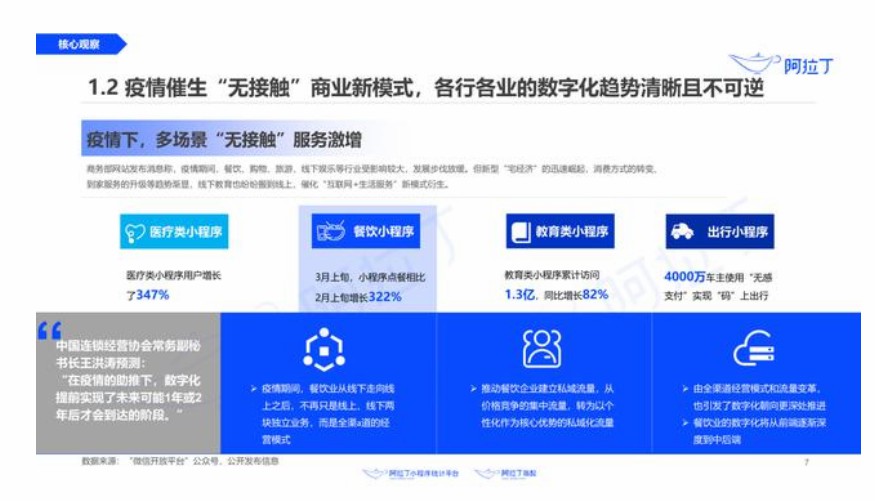 在疫情期间,小程序成为进行远程互动和获取“无接触”服务的重要途径。医疗、餐饮和教育类小程序的使用量均实现了大幅增长。此外,在疫情的助推下,餐饮企业形成全渠道的经营模式,建立私域流量,餐饮业的数字化更是从前端逐渐深入到中后端。