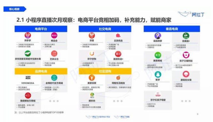 在小程序直播领域中,网络购物小程序的占比接近六成,而在这其中垂直电商小程序占最大比例。而且,小程序直播展现了较好的引流效果,垂直电商小程序在4月末的平均用户访问量相较3月初增长8.3%,有诸多品牌都参与其中,例如百果园推出水果专题溯源和产地直播,蜜芽开通直播广场和平台专题直播,蘑菇街女装展开大牌专场以及商家的直播。