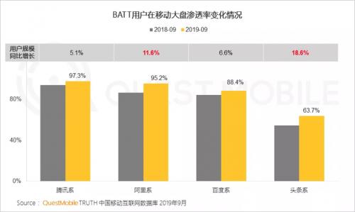 QuestMobile此前发布的《2019中国移动互联网秋季大报告》显示,BAT依然是用户体量最大的三个互联网公司,三家用户规模均超过10亿,其他互联网公司则远低于这一水平。而百度三季度财报则显示,9月百度App日活跃用户达1.89亿,同比增长25%。