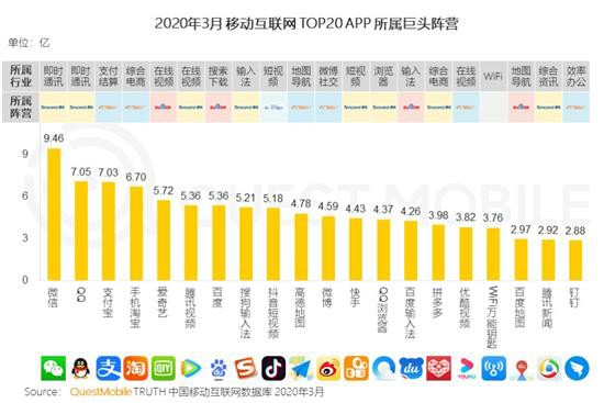 QuestMobile刚刚发布的《2020中国移动互联网春季大报告》显示,微信的月活跃用户9.46亿,高出支付宝7.03亿35%。