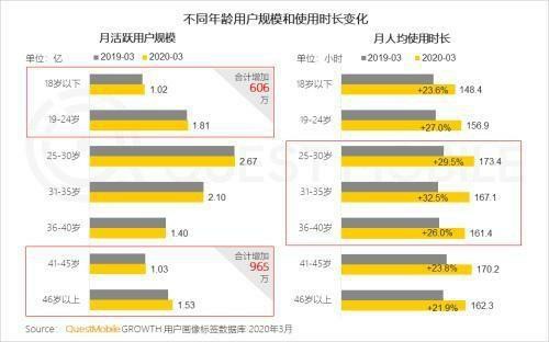 《2020中国移动互联网春季大报告》显示,2020年3月月活跃用户相比去年增量为1571万,其中61%即965万来自41岁以上、尤其是46岁以上的中老年群体。而在25—40岁之间,已经没有用户增量了。