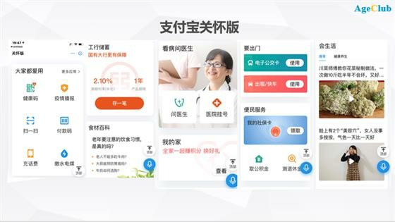 2019年6月,支付宝推出面向老人的小程序“关怀版”,字体、图标均为大号显示,功能主要是老年人常用功能,如充话费、水电煤缴费、查社保和医保、电子公交卡(地铁卡)、在线打车、购买超市打折商品等。